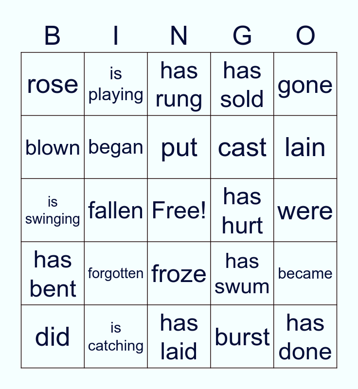 This bingo card has a free space and 27 words: has swum, had, cast, has laid, blown, has rung, is playing, has bent, has hurt, became, is swinging, has sold, did, is catching, lain, is laying, began, put, forgotten, rose, were, burst, fallen, has done, froze, gone and went.