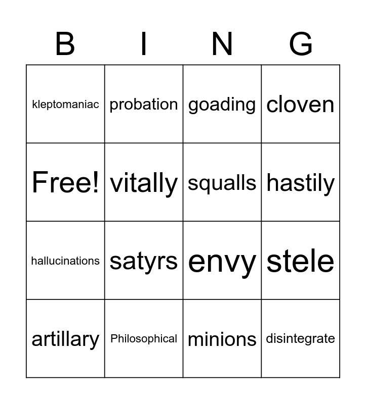 This bingo card has 16 words: Philosophical, stele, goading, kleptomaniac, hallucinations, probation, envy, minions, Free!, vitally, artillary, cloven, satyrs, hastily, squalls and disintegrate.