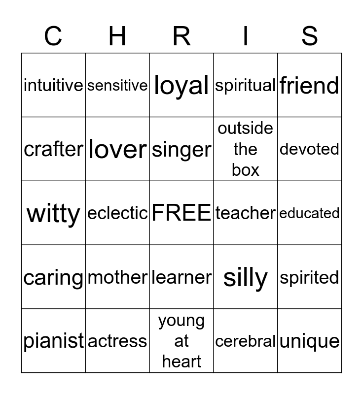 This bingo card has a free space and 24 words: mother, actress, singer, pianist, friend, intuitive, crafter, sensitive, teacher, learner, outside the box, witty, silly, spirited, lover, cerebral, educated, loyal, devoted, eclectic, unique, caring, spiritual and young at heart.