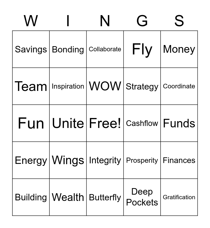 This bingo card has a free space and 24 words: Wings, Wealth, WOW, Building, Money, Savings, Team, Bonding, Cashflow, Integrity, Strategy, Fun, Prosperity, Finances, Inspiration, Deep Pockets, Funds, Collaborate, Coordinate, Unite, Gratification, Energy, Fly and Butterfly.
