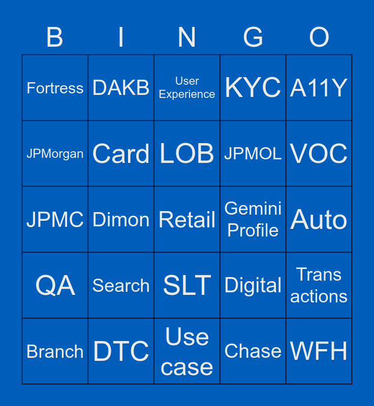 This bingo card has 50 words: DAO, Retail, Quick Deposit, Use case, Search, Real Estate, DAKB, Accessibility, JPMorgan, Fraud, Card, KYC, Trans actions, Digital, PWS, Commercial, LOB, Gemini Profile, HELOC, A11Y, Dimon, Chase, Fortress, JPMOL, Business Banking, WFH, VOC, Human, User Experience, SLT, CCB, JIRA, Release, SCRUM, DTC, Secure, Public, ADA, Spanish, Auto, Home Lending, Wealth Management, Controls, Agile, Branch, JPMC, Confluence, Sharepoint, QA and Development.