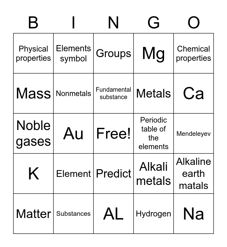 This bingo card has a free space and 24 words: Element, Substances, Fundamental substance, Matter, Chemical properties, Physical properties, Mass, Elements symbol, Periodic table of the elements, Predict, Metals, Noble gases, Alkali metals, Alkaline earth matals, Nonmetals, Hydrogen, Mendeleyev, Groups, Ca, Au, Na, K, Mg and AL.