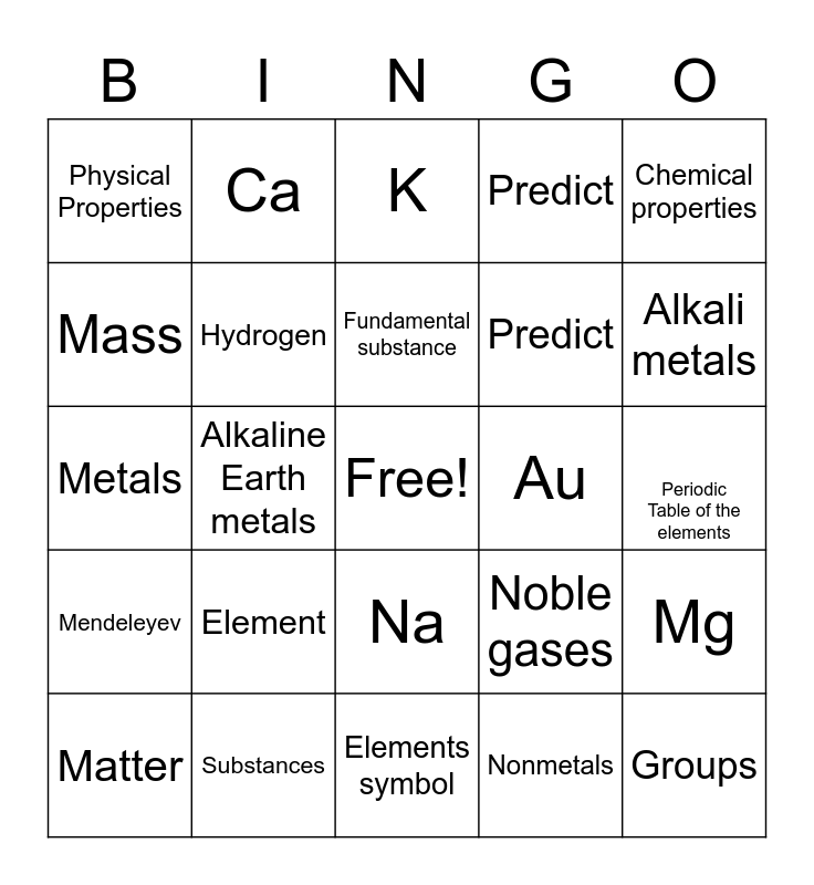 This bingo card has a free space and 24 words: Element, Substances, Fundamental substance, Matter, Chemical properties, Physical Properties, Mass, Ca, Au, Na, Predict, Metals, Noble gases, Mg, Hydrogen, Nonmetals, Periodic Table of the elements, K, Alkali metals, Alkaline Earth metals, Groups, Mendeleyev, Predict and Elements symbol.