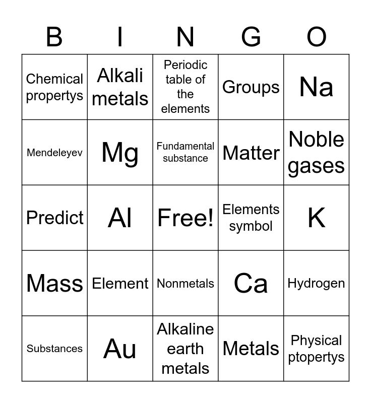 This bingo card has a free space and 24 words: Element, Au, Fundamental substance, Substances, Na, Chemical propertys, Mendeleyev, Alkali metals, Elements symbol, Nonmetals, Matter, Predict, Ca, Hydrogen, Mg, Metals, K, Periodic table of the elements, Noble gases, Al, Physical ptopertys, Mass, Groups and Alkaline earth metals.