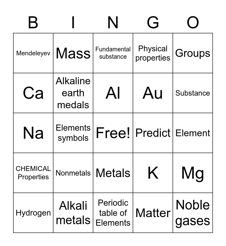 This bingo card has a free space and 24 words: Nonmetals, Alkali metals, Al, Hydrogen, Groups, Mendeleyev, Ca, Mass, Predict, Metals, Au, Na, K, Mg, Alkaline earth medals, Matter, Element, Fundamental substance, Substance, Elements symbols, Noble gases, CHEMICAL Properties, Physical properties and Periodic table of Elements.