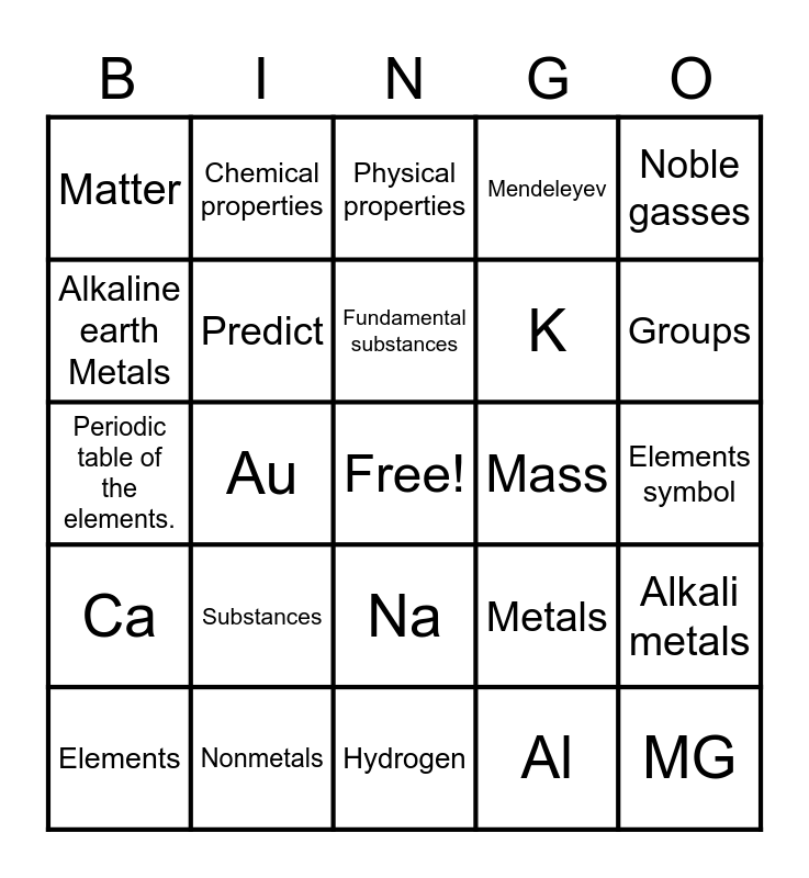This bingo card has a free space and 24 words: Elements, Substances, Fundamental substances, Al, Noble gasses, Matter, Chemical properties, Physical properties, Mass, Elements symbol, Periodic table of the elements., Predict, Metals, Alkali metals, Alkaline earth Metals, Nonmetals, Hydrogen, Mendeleyev, Groups, Ca, Au, Na, K and MG.