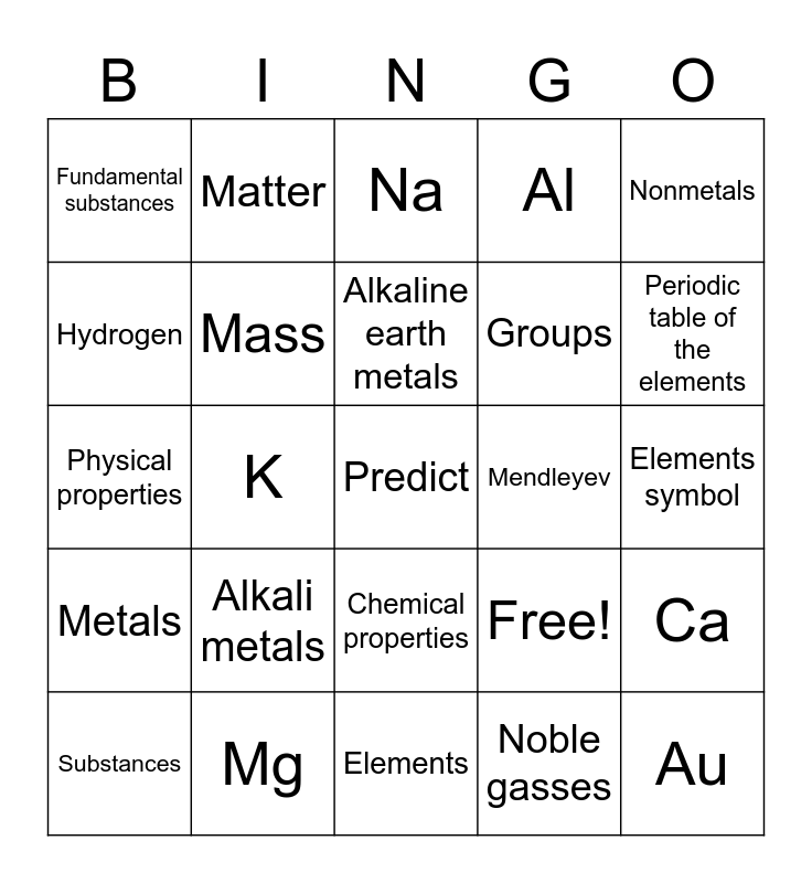 This bingo card has 25 words: Alkali metals, Elements, Alkaline earth metals, Substances, Nonmetals, Fundamental substances, Hydrogen, Matter, Mendleyev, Chemical properties, Groups, Physical properties, Free!, Ca, Mass, Au, Elements symbol, Na, Periodic table of the elements, K, Predict, Mg, Metals, Al and Noble gasses.