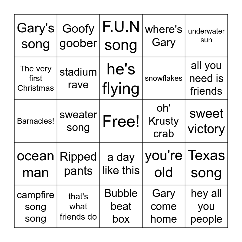 This bingo card has a free space and 24 words: Ripped pants, that's what friends do, he's flying, campfire song song, underwater sun, Gary's song, The very first Christmas, Goofy goober, oh' Krusty crab, a day like this, snowflakes, Barnacles!, you're old, Texas song, stadium rave, Gary come home, sweet victory, F.U.N song, all you need is friends, sweater song, hey all you people, ocean man, where's Gary and Bubble beat box.