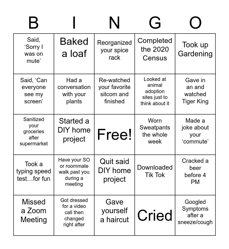 This bingo card has a free space and 24 words: Have your SO or roommate walk past you during a meeting, Got dressed for a video call then changed right after, Re-watched your favorite sitcom and finished, Missed a Zoom Meeting, Took up Gardening, Said, ‘Sorry I was on mute’, Said, ‘Can everyone see my screen’, Baked a loaf, Worn Sweatpants the whole week, Quit said DIY home project, Looked at animal adoption sites just to think about it, Sanitized your groceries after supermarket, Downloaded Tik Tok, Cracked a beer before 4 PM, Had a conversation with your plants, Cried, Made a joke about your ‘commute’, Reorganized your spice rack, Gave in an and watched Tiger King, Started a DIY home project, Googled Symptoms after a sneeze/cough, Took a typing speed test…for fun, Completed the 2020 Census and Gave yourself a haircut.