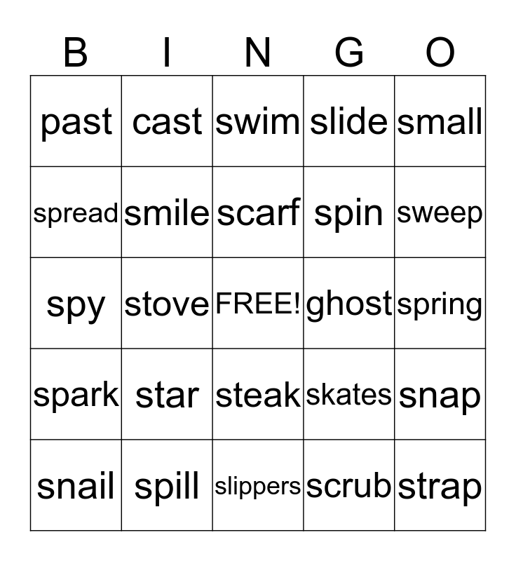 This bingo card has a free space and 24 words: star, spill, scarf, snail, small, past, spread, cast, ghost, steak, spin, spy, skates, snap, smile, scrub, spring, swim, sweep, stove, strap, spark, slide and slippers.