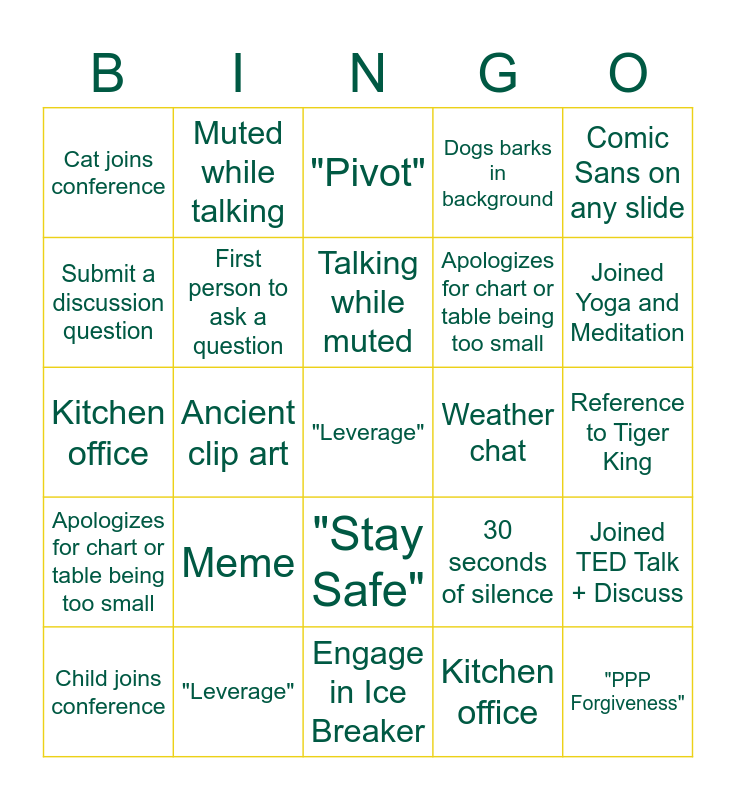 ⚠ This card has duplicate items: Dogs barks in background (2), "Pivot" (2), Participated in Fancy Sips event (2), Video Freezes (2), Muted while talking (2), "Can you see my screen?" (2), Talking while muted (2), Rabbit Trail (2), Awkward backdrop (2), *cough* (2), Reference to Tiger King (2), First person to ask a question (2), Weather chat (2), "Best Practice" (2), Cat joins conference (2), Child joins conference (2), Submit a discussion question (2), 30 seconds of silence (2), Swearing (2), “What an election night” (2), Apologizes for chart or table being too small (2), "PPP Forgiveness" (2), Comic Sans on any slide (2), Ancient clip art (2), “UMMMMMM" (2), Runs out of time for questions (2), “Advisory” (2), Uses obscure acronym without definition (2), Doesn't share LinkedIn handle (2), Meme (2), "Stay Safe" (2), Kitchen office (2), "Window of opportunity" (2), Sirens in background (2), Engage in Ice Breaker (2), “New Normal” (2), Using your firm’s custom Zoom background (2), Joined Yoga and Meditation (2), Joined TED Talk + Discuss (2), Attended 8 sessions (2)