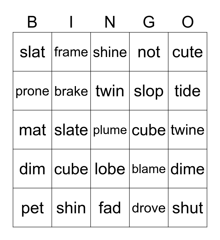 This bingo card has 35 words: globe, lob, cub, brake, lobe, not, prone, slp, twin, fade, mat, cute, Free!, chat, slat, cube, drove, slate, dim, plume, blame, pet, dime, shin, shine, tide, shut, plum, slop, twine, Pete, fad, cube, frame and slop.