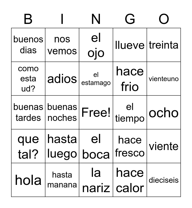 This bingo card has a free space and 24 words: hola, hasta luego, el estamago, hace calor, treinta, buenos dias, nos vemos, el ojo, el tiempo, ocho, buenas tardes, adios, hace fresco, viente, como esta ud?, hasta manana, la nariz, llueve, vienteuno, que tal?, buenas noches, el boca, hace frio and dieciseis.