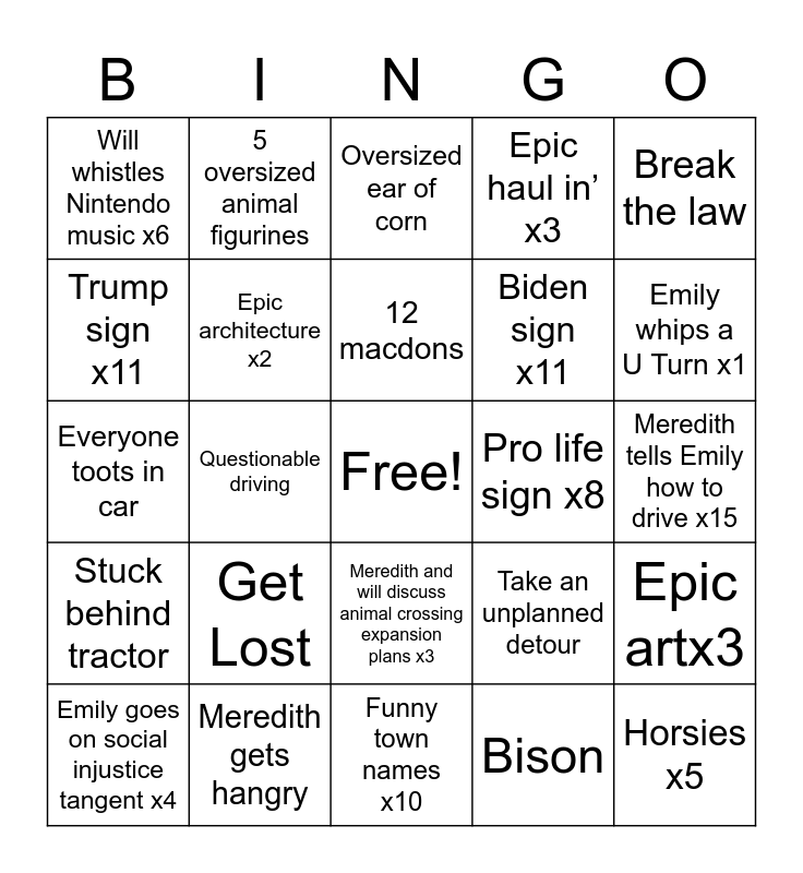 This bingo card has a free space and 24 words: Get Lost, Meredith gets hangry, 12 macdons, Emily goes on social injustice tangent x4, Break the law, Will whistles Nintendo music x6, Trump sign x11, 5 oversized animal figurines, Pro life sign x8, Meredith and will discuss animal crossing expansion plans x3, Biden sign x11, Everyone toots in car, Take an unplanned detour, Epic artx3, Epic architecture x2, Bison, Meredith tells Emily how to drive x15, Oversized ear of corn, Emily whips a U Turn x1, Questionable driving, Horsies x5, Stuck behind tractor, Epic haul in’ x3 and Funny town names x10.