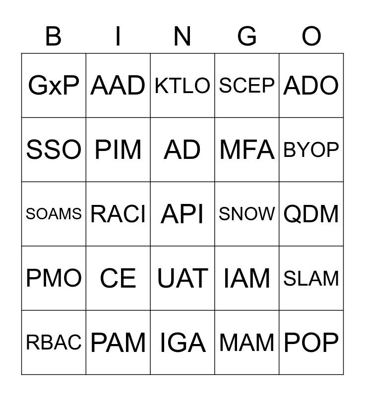 This bingo card has 25 words: CE, IGA, AD, RBAC, ADO, GxP, SSO, AAD, SNOW, UAT, MFA, SOAMS, IAM, SLAM, PIM, POP, QDM, KTLO, BYOP, RACI, API, PAM, PMO, SCEP and MAM.
