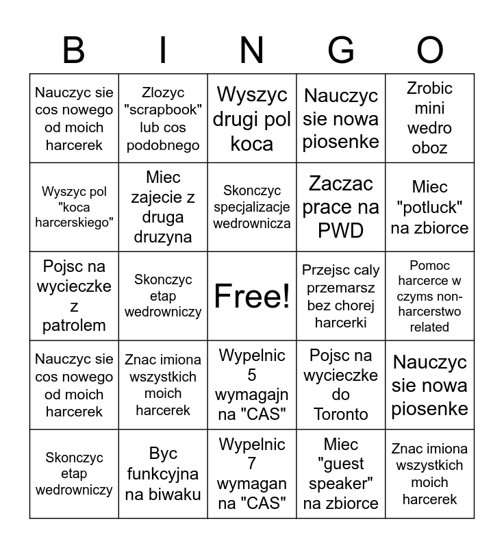 This bingo card has a free space and 24 words: Znac imiona wszystkich moich harcerek, Byc funkcyjna na biwaku, Skonczyc specjalizacje wedrownicza, Skonczyc etap wedrowniczy, Zrobic mini wedro oboz, Nauczyc sie cos nowego od moich harcerek, Wyszyc pol "koca harcerskiego", Zlozyc "scrapbook" lub cos podobnego, Przejsc caly przemarsz bez chorej harcerki, Wypelnic 5 wymagajn na "CAS", Zaczac prace na PWD, Pojsc na wycieczke z patrolem, Pojsc na wycieczke do Toronto, Nauczyc sie nowa piosenke, Miec zajecie z druga druzyna, Miec "guest speaker" na zbiorce, Pomoc harcerce w czyms non-harcerstwo related, Wyszyc drugi pol koca, Miec "potluck" na zbiorce, Skonczyc etap wedrowniczy, Znac imiona wszystkich moich harcerek, Nauczyc sie cos nowego od moich harcerek, Nauczyc sie nowa piosenke and Wypelnic 7 wymagan na "CAS".