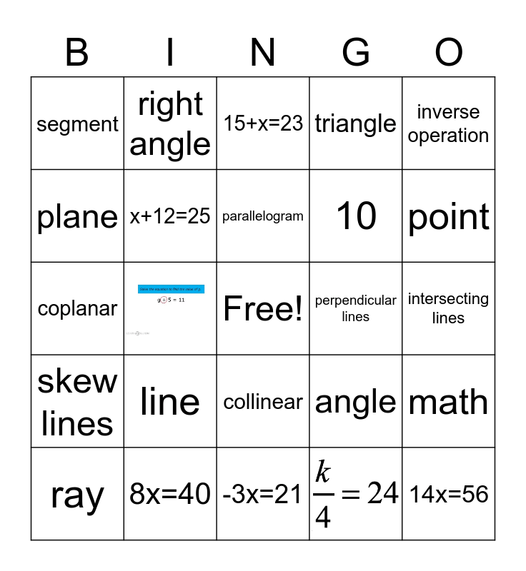 This bingo card has 2 images, a free space and 27 words: ray, parallel lines, x-6=5, segment, 15+x=23, x+12=25, line, perpendicular lines, 8x=40, intersecting lines, 14x=56, -3x=21, point, -15x=0, collinear, skew lines, inverse operation, coplanar, angle, 3x=6, 10, plane, triangle, right angle, math, parallelogram and capital letter.