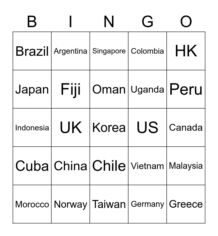 This bingo card has a free space and 24 words: China, Norway, Oman, Morocco, HK, Brazil, Japan, Argentina, US, Chile, Uganda, Indonesia, Vietnam, Malaysia, Fiji, Germany, Canada, Singapore, Peru, UK, Greece, Cuba, Colombia and Taiwan.