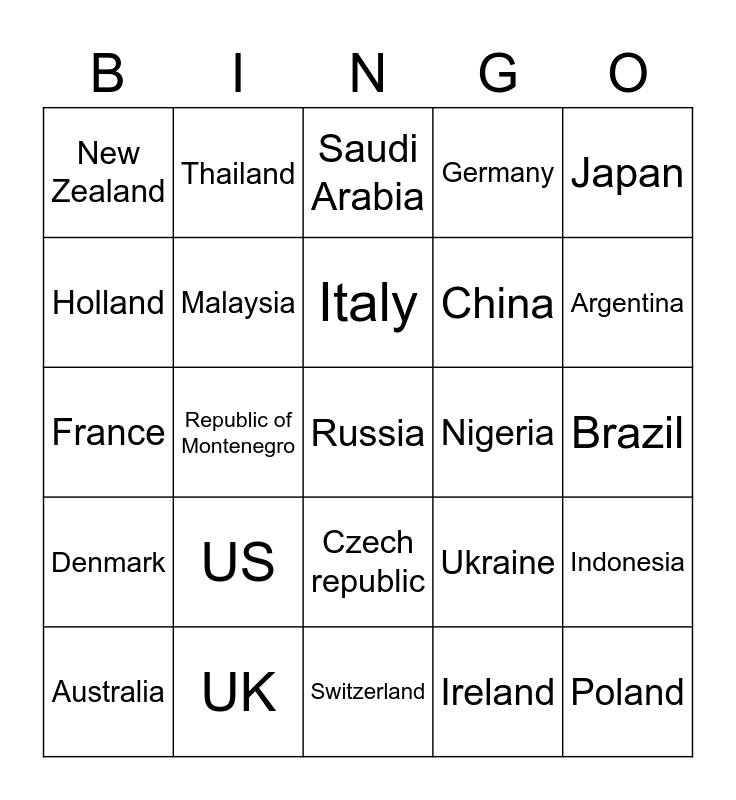 This bingo card has a free space and 24 words: US, UK, Italy, Australia, Japan, New Zealand, Holland, Thailand, Nigeria, Czech republic, China, France, Ukraine, Indonesia, Malaysia, Ireland, Brazil, Saudi Arabia, Argentina, Republic of Montenegro, Poland, Denmark, Germany and Switzerland.