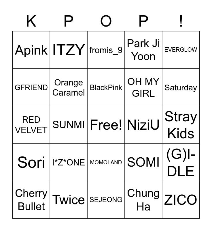 This bingo card has a free space and 24 words: I*Z*ONE, Twice, BlackPink, Cherry Bullet, EVERGLOW, Apink, GFRIEND, ITZY, NiziU, MOMOLAND, OH MY GIRL, RED VELVET, SOMI, (G)I-DLE, Orange Caramel, Chung Ha, Stray Kids, fromis_9, Saturday, SUNMI, ZICO, Sori, Park Ji Yoon and SEJEONG.