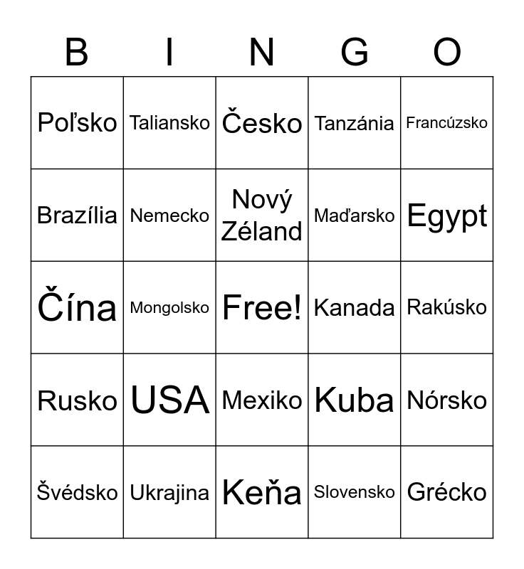 This bingo card has a free space and 24 words: USA, Ukrajina, Nový Zéland, Švédsko, Francúzsko, Poľsko, Brazília, Taliansko, Kanada, Mexiko, Maďarsko, Čína, Kuba, Nórsko, Nemecko, Slovensko, Rakúsko, Česko, Egypt, Mongolsko, Grécko, Rusko, Tanzánia and Keňa.