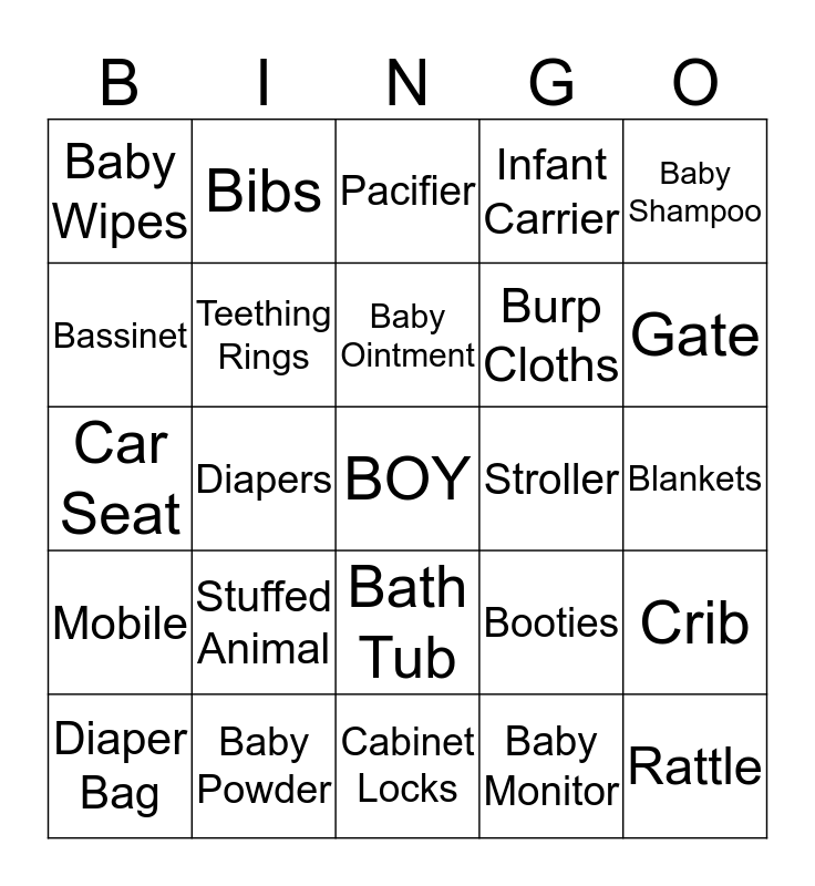 This bingo card has a free space and 26 words: Bath Tub, Baby Monitor, Baby Ointment, Baby Powder, Baby Shampoo, Baby Wipes, Bassinet, Bibs, Blankets, Booties, Burp Cloths, Car Seat, Crib, Diaper Bag, Diapers, High Chair, Infant Carrier, Mobile, Pacifier, Rattle, Gate, Cabinet Locks, Stroller, Stuffed Animal, Teething Rings and Toys.