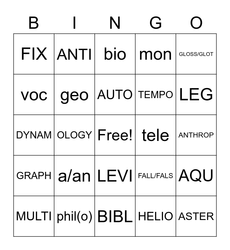 This bingo card has a free space and 29 words: MULTI, NEUR, OLOGY, MAN, FIX, bio, geo, a/an, tele, phil(o), ANTHROP, ASTER, BIBL, HELIO, LEG, JUVEN, LEVI, GRAPH, GLOSS/GLOT, DYNAM, FALL/FALS, FIN, TEMPO, voc, mon, ANTI, AQU, AUTO and CHROM(E).