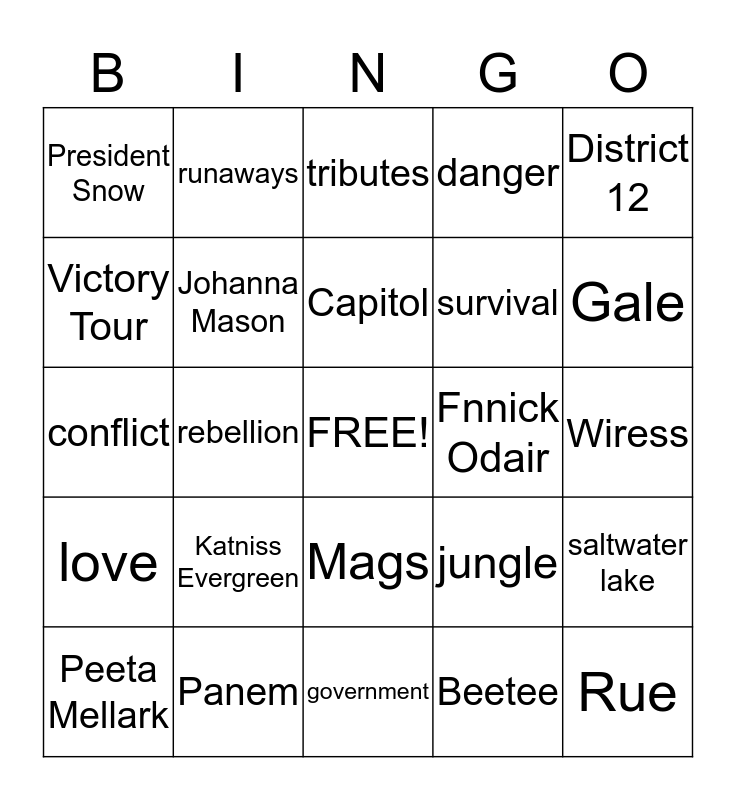 This bingo card has a free space and 24 words: Katniss Evergreen, Panem, Capitol, Peeta Mellark, District 12, President Snow, Victory Tour, runaways, Fnnick Odair, Mags, survival, conflict, jungle, saltwater lake, Johanna Mason, Beetee, Wiress, tributes, Gale, rebellion, Rue, love, danger and government.