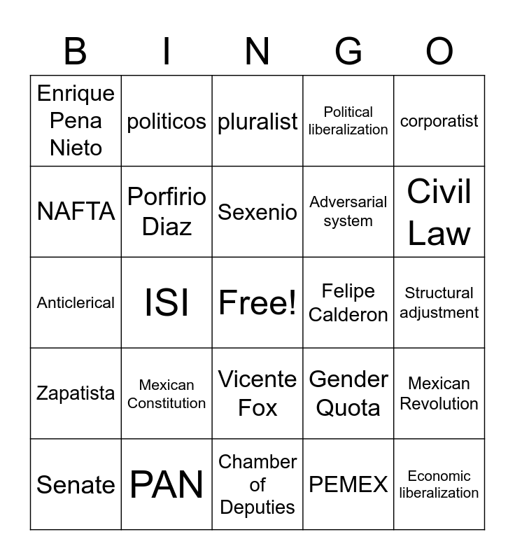 This bingo card has a free space and 37 words: Mestizo Amerindian Porfirio Diaz Mexican Revolution Mexican Constitution Sexenio Cardenas corporatist ejidos ISI Political liberalization Economic liberalization Structural adjustment NAFTA Zapatista IFE/INE, Mestizo, Amerindian, Porfirio Diaz, Mexican Revolution, Mexican Constitution, Sexenio, Cardenas, corporatist, ejidos, ISI, Political liberalization, Economic liberalization, Structural adjustment, NAFTA, Zapatista, IFE/INE, pluralist, Vicente Fox, Felipe Calderon, Enrique Pena Nieto, Civil Law, Senate, Chamber of Deputies, parastatals, PEMEX, politicos, tecnicos, patron-clientalism, PRI, PRD, PAN, Anticlerical, Maquilladoras, Gender Quota, Adversarial system and Informal Economy.