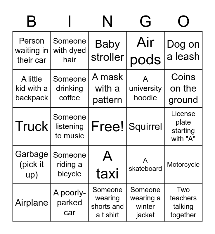 This bingo card has a free space and 37 words: A number the same as your age, Scooter, Blue, Someone drinking coffee, Motorcycle, Someone riding a bicycle, A mask with a pattern, Jordans, Dog on a leash, A van, Someone listening to music, Air pods, Two teachers talking together, License plate starting with "A", A little kid with a backpack, Garbage (pick it up), Helicopter, Baby stroller, A taxi, Squirrel, Person waiting in their car, Coins on the ground, Airplane, Someone wearing shorts and a t shirt, A person wearing sandals, Someone wearing a winter jacket, Someone with dyed hair, Somebody wearing MPC apparel, Somebody getting a drink, A dead tree, Someone eating, A poorly-parked car, Truck, A Blue Jays hat, A skateboard, A university hoodie and A jogger.