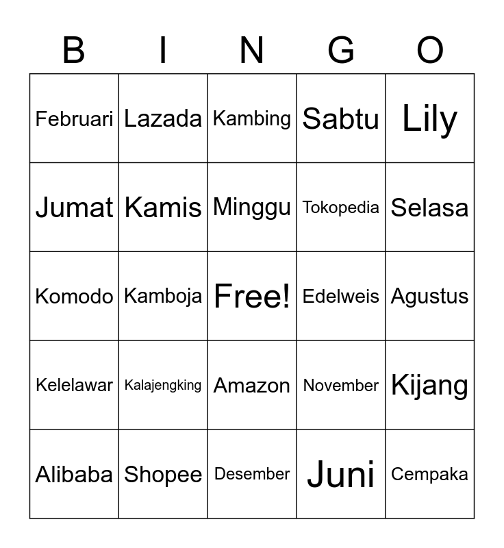This bingo card has a free space and 24 words: Kalajengking, Shopee, Minggu, Alibaba, Lily, Februari, Jumat, Lazada, Edelweis, Amazon, Tokopedia, Komodo, November, Kijang, Kamis, Juni, Agustus, Kambing, Selasa, Kamboja, Cempaka, Kelelawar, Sabtu and Desember.