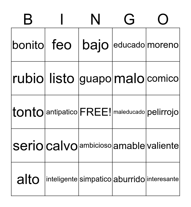 This bingo card has a free space and 24 words: calvo, inteligente, guapo, alto, moreno, bonito, rubio, feo, maleducado, ambicioso, malo, tonto, amable, valiente, listo, aburrido, pelirrojo, bajo, comico, antipatico, interesante, serio, educado and simpatico.