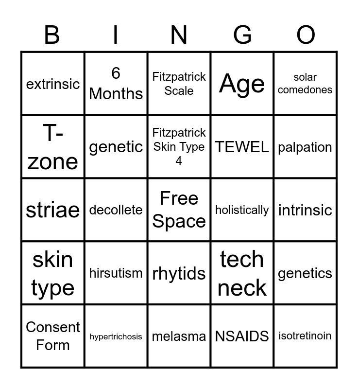This bingo card has a free space and 29 words: Consent Form, Contraindication, decollete, dehyrdration, extrinsic, Fitzpatrick Scale, genetic, hirsutism, holistically, hypertrichosis, intrinsic, isotretinoin, melasma, NSAIDS, palpation, photosenitivity, rhytids, skin type, solar comedones, striae, tech neck, telangiectasia, TEWEL, T-zone, Age, 6 Months, genetics, Fitzpatrick Skin Type 4 and Fitzpatrick Skin Type 1.