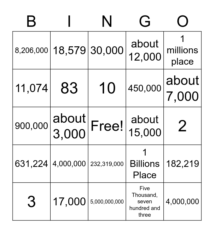 This bingo card has a free space and 24 words: 4,000,000, 17,000, 10, 3, 1 millions place, 8,206,000, 11,074, 18,579, about 15,000, 232,319,000, 450,000, 900,000, 1 Billions Place, 182,219, 83, Five Thousand, seven hundred and three, 2, 30,000, about 7,000, about 3,000, 4,000,000, 631,224, about 12,000 and 5,000,000,000.