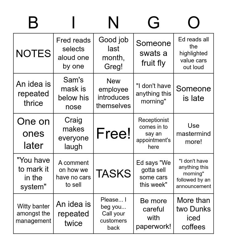 This bingo card has a free space and 24 words: A comment on how we have no cars to sell, An idea is repeated twice, New employee introduces themselves, Witty banter amongst the management, Ed reads all the highlighted value cars out loud, NOTES, An idea is repeated thrice, Fred reads selects aloud one by one, Receptionist comes in to say an appointment's here, TASKS, "I don't have anything this morning", One on ones later, Ed says "We gotta sell some cars this week", "I don't have anything this morning" followed by an announcement, Sam's mask is below his nose, Be more careful with paperwork!, Use mastermind more!, Good job last month, Greg!, Someone is late, Craig makes everyone laugh, More than two Dunks iced coffees, "You have to mark it in the system", Someone swats a fruit fly and Please... I beg you... Call your customers back.