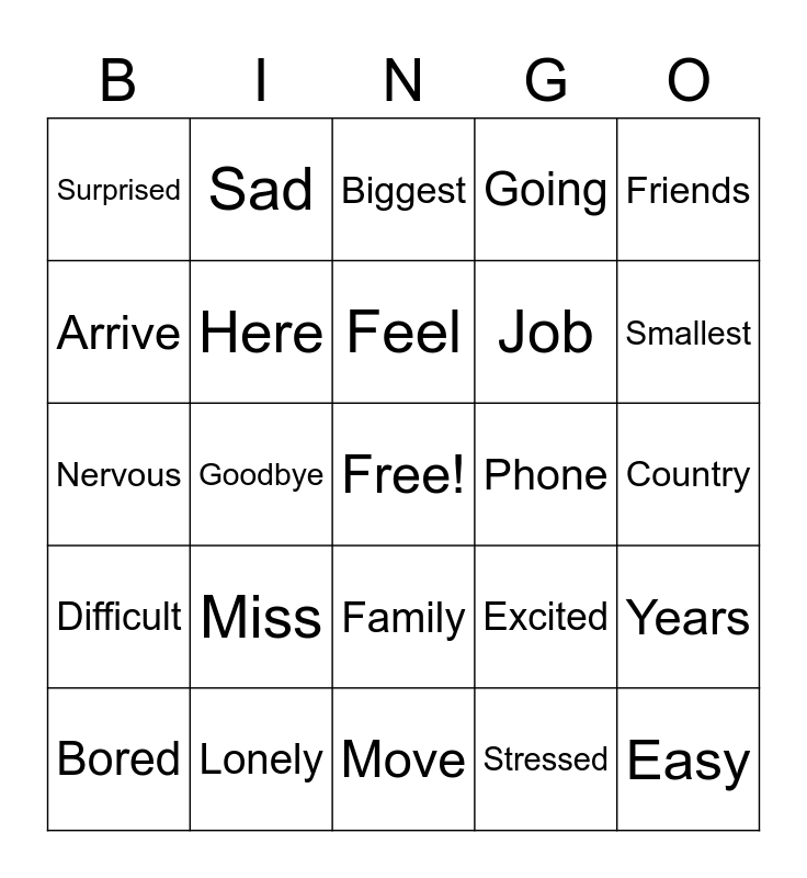 This bingo card has a free space and 26 words: Family, Stressed, Feel, Lonely, Friends, Surprised, Arrive, Sad, Country, Excited, Job, Nervous, Years, Bored, Goodbye, Happy, Going, Difficult, Biggest, Easy, Smallest, Move, Phone, Miss, Here and Felt.