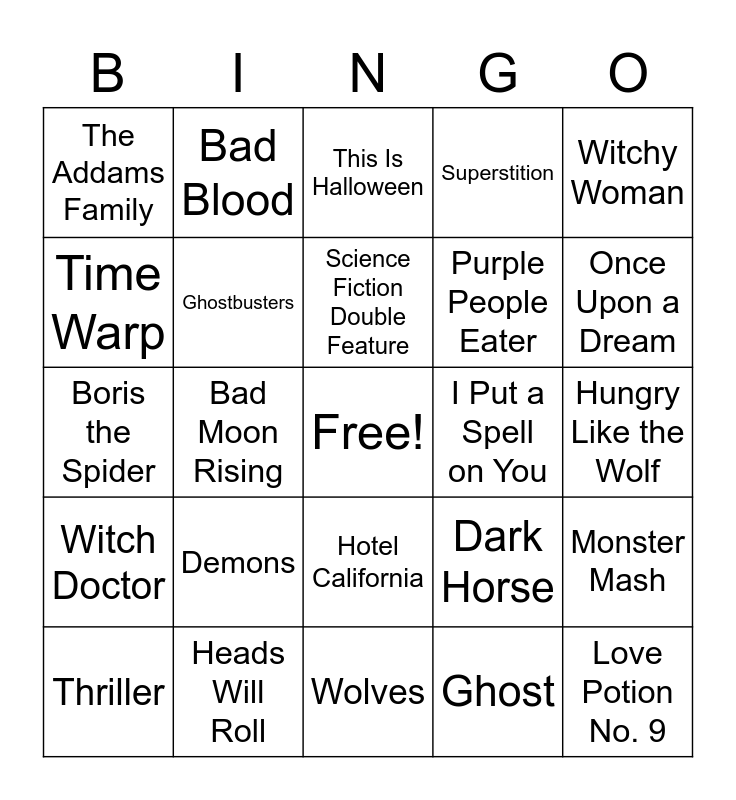 This bingo card has a free space and 24 words: Demons, Heads Will Roll, Science Fiction Double Feature, Thriller, Witchy Woman, The Addams Family, Time Warp, Bad Blood, I Put a Spell on You, Hotel California, Purple People Eater, Boris the Spider, Dark Horse, Monster Mash, Ghostbusters, Ghost, Hungry Like the Wolf, This Is Halloween, Once Upon a Dream, Bad Moon Rising, Love Potion No. 9, Witch Doctor, Superstition and Wolves.