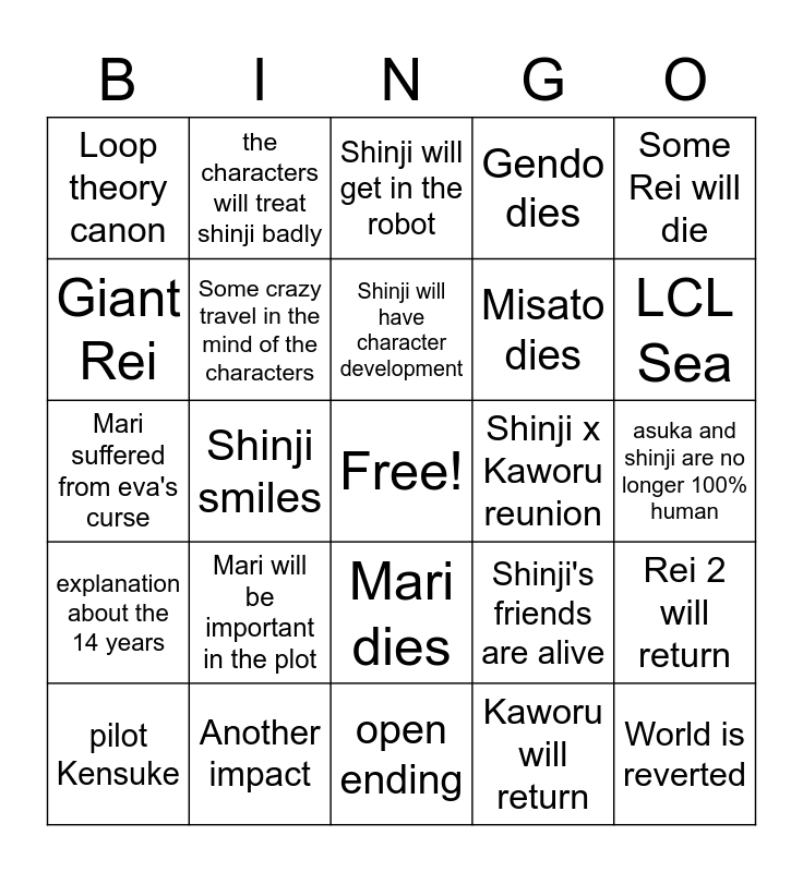 This bingo card has a free space and 24 words: Mari will be important in the plot, Another impact, Shinji will have character development, pilot Kensuke, Some Rei will die, Loop theory canon, Giant Rei, the characters will treat shinji badly, Shinji x Kaworu reunion, Mari dies, Misato dies, Mari suffered from eva's curse, Shinji's friends are alive, Rei 2 will return, Some crazy travel in the mind of the characters, Kaworu will return, asuka and shinji are no longer 100% human, Shinji will get in the robot, LCL Sea, Shinji smiles, World is reverted, explanation about the 14 years, Gendo dies and open ending.