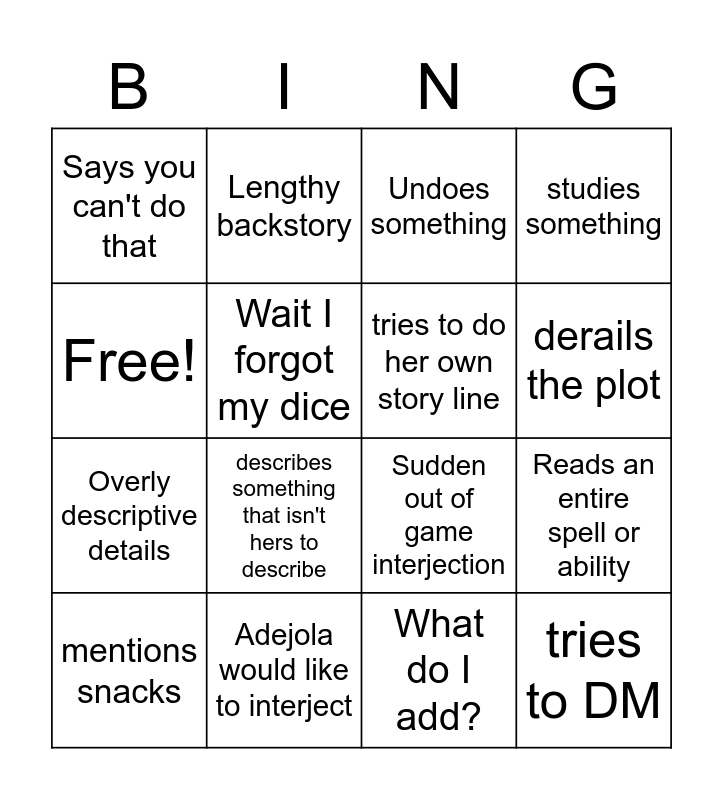 This bingo card has 16 words: Adejola would like to interject, Reads an entire spell or ability, Undoes something, Says you can't do that, Overly descriptive details, Lengthy backstory, Sudden out of game interjection, What do I add?, Free!, Wait I forgot my dice, mentions snacks, studies something, describes something that isn't hers to describe, derails the plot, tries to do her own story line and tries to DM.