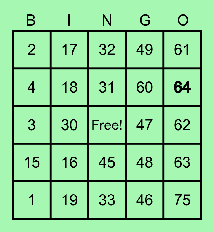 This bingo card has a free space and 24 words: 1, 16, 31, 46, 61, 2, 17, 32, 47, 62, 3, 18, 48, 63, 4, 19, 33, 49, 64, 15, 30, 45, 60 and 75.