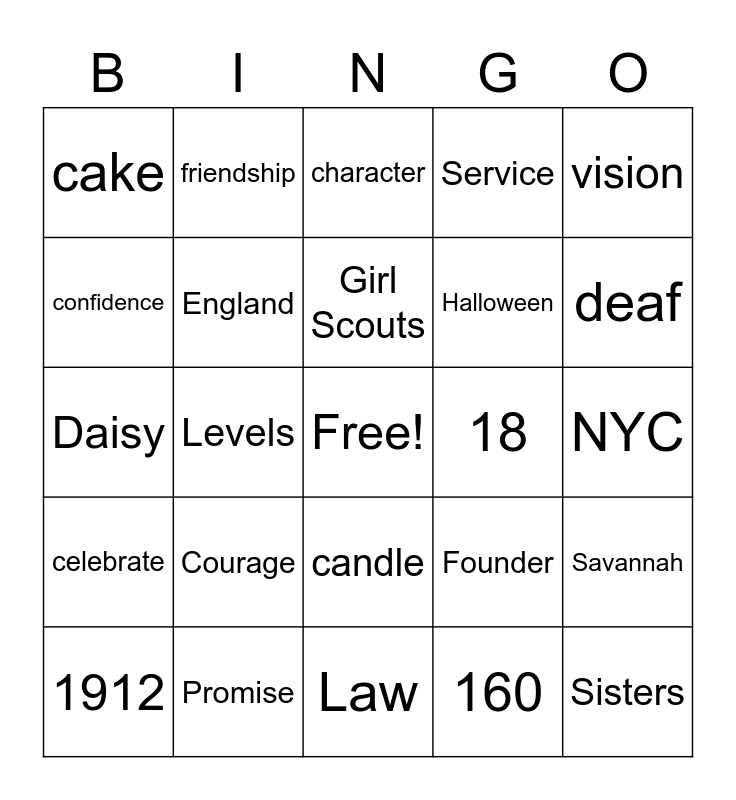 This bingo card has a free space and 24 words: Courage, Promise, Girl Scouts, 1912, vision, cake, confidence, friendship, 18, candle, Halloween, Daisy, Founder, Savannah, England, 160, NYC, character, deaf, Levels, Sisters, celebrate, Service and Law.