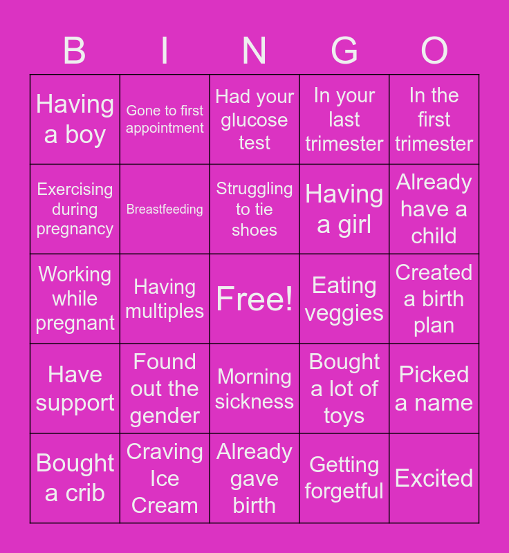 This bingo card has a free space and 24 words: Found out the gender, Craving Ice Cream, Struggling to tie shoes, Bought a crib, In the first trimester, Having a boy, Exercising during pregnancy, Gone to first appointment, Eating veggies, Morning sickness, Having a girl, Working while pregnant, Bought a lot of toys, Picked a name, Breastfeeding, Getting forgetful, Created a birth plan, Had your glucose test, Already have a child, Having multiples, Excited, Have support, In your last trimester and Already gave birth.