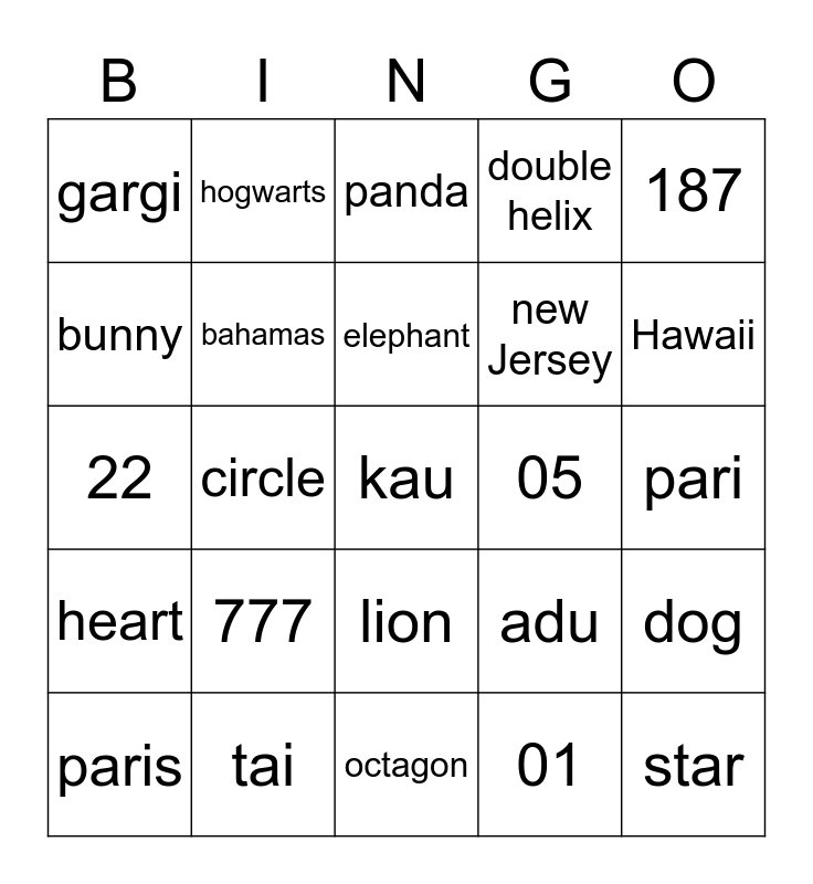 This bingo card has a free space and 24 words: 777, tai, elephant, paris, 187, gargi, bunny, hogwarts, 05, lion, new Jersey, 22, adu, dog, bahamas, 01, pari, panda, Hawaii, circle, star, heart, double helix and octagon.