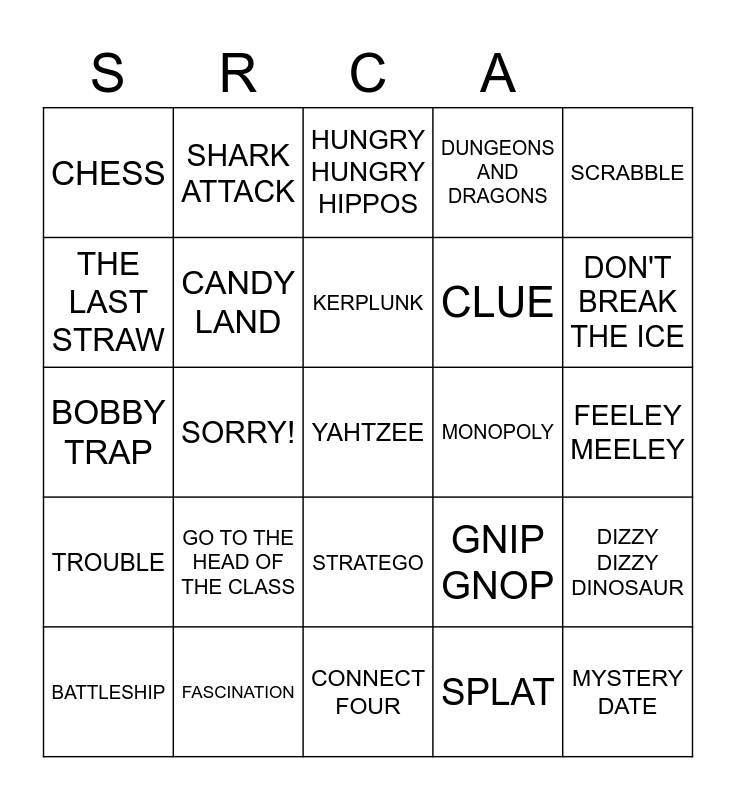This bingo card has 57 words: BACKGAMMON, BATTLESHIP, CHECKERS, CHESS, CONNECT FOUR, BALDERDASH, CANDY LAND, CHINESE CHECKERS, CLUE, CRANIUM, DUNGEONS AND DRAGONS, THE GAME OF LIFE, PICTIONARY, SCATTERGORIES, SCENE IT, SNAKES AND LADDERS, SCRABBLE, SORRY!, TRIVIAL PURSUIT, YAHTZEE, MONOPOLY, RISK, GNIP GNOP, HUNGRY HUNGRY HIPPOS, JENGA, KERPLUNK, OPERATION, TWISTER, DON'T BREAK THE ICE, MOUSE TRAP, UPWORDS, GREEN GHOST, VOICE OF THE MUMMY, KABOOM, FEELEY MEELEY, THE LAST STRAW, DON'T SPILL THE BEANS, BOBBY TRAP, GUESS WHO, TROUBLE, SHARK ATTACK, STRATEGO, MYSTERY DATE, KA-BALA, BARREL OF MONKEYS, CHUTES AND LADDERS, GO TO THE HEAD OF THE CLASS, FASCINATION, AGGRAVATION, STAY ALIVE, PIZZA PARTY, SPLAT, CROCODILE DENTIST, 13 DEAD END DRIVE, TABOO, DIZZY DIZZY DINOSAUR and MR. BUCKET.