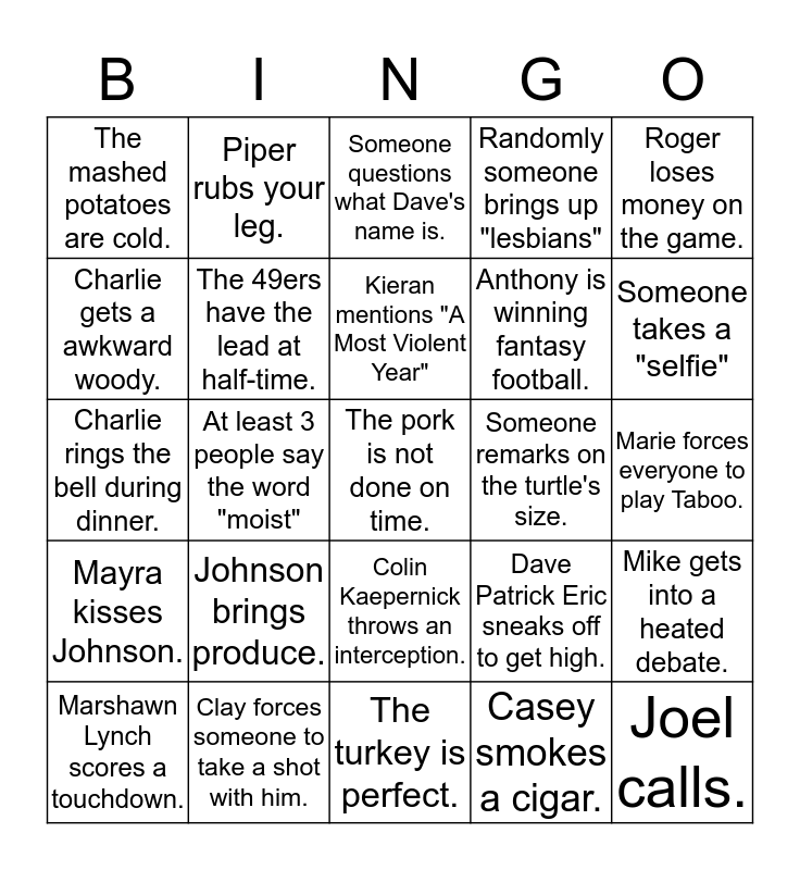 This bingo card has a free space and 24 words: Johnson brings produce., Clay forces someone to take a shot with him., Kieran mentions "A Most Violent Year", Marshawn Lynch scores a touchdown., Roger loses money on the game., The mashed potatoes are cold., Charlie gets a awkward woody., Piper rubs your leg., Someone remarks on the turtle's size., Colin Kaepernick throws an interception., Anthony is winning fantasy football., Charlie rings the bell during dinner., Dave Patrick Eric sneaks off to get high., Mike gets into a heated debate., The 49ers have the lead at half-time., Casey smokes a cigar., Marie forces everyone to play Taboo., Someone questions what Dave's name is., Someone takes a "selfie", At least 3 people say the word "moist", Joel calls., Mayra kisses Johnson., Randomly someone brings up "lesbians" and The turkey is perfect..