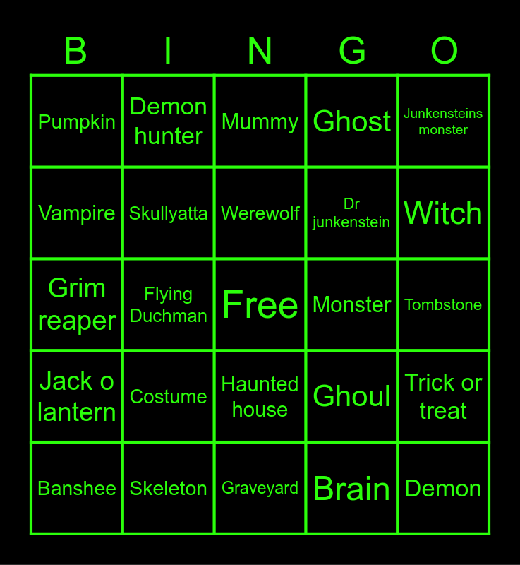 This bingo card has a free space and 33 words: Warlock, Possessed, Flying Duchman, Slasher 76, Jack o lantern, Skullyatta, Junkensteins monster, Banshee, Demon hunter, Zombie, Werewolf, Mummy, Candy Corn, Spider, Monster, Witch, Skeleton, Grim reaper, Costume, Ghoul, Haunted house, Spooky, Pumpkin, Tombstone, Graveyard, Demon, Ghost, Dr junkenstein, Vampire, Trick or treat, Clown, Brain and Blood.