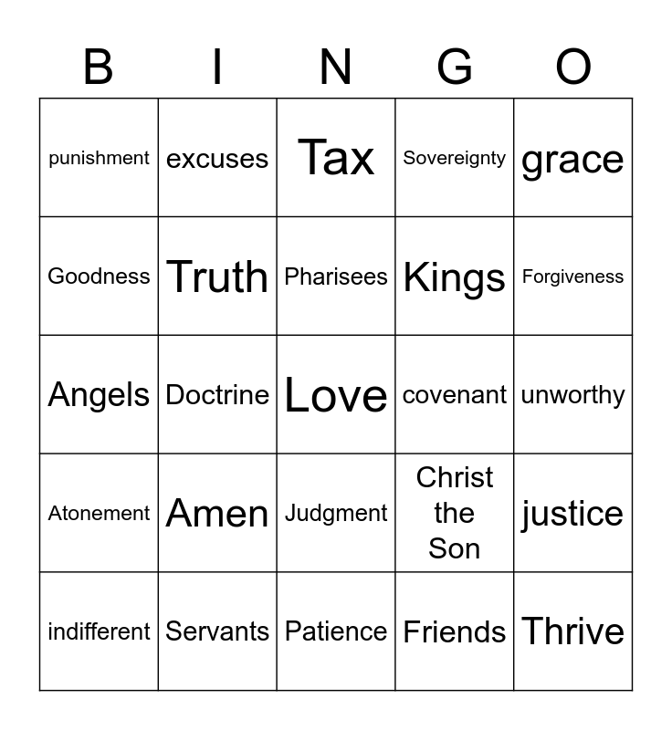 This bingo card has a free space and 57 words: holiness, indifferent, relationship, punishment, Patience, Lord, Truth, see a multicolor umbrella, Kings, Ransom, Sovereignty, Scheme, Government, Nations, Mediator, Wisdom, grace, Doctrine, Infinite, Thrive, covenant, chosen, Christ the Son, Tax, endure, Pharisees, Repentance, Curses, Forgiveness, Jury summons, Long-suffering, Submit, Savior, Reject, unworthy, Goodness, see a plane or helicopter, Angels, obedience, Atonement, excuses, Judgment, Church, BBQ, Hear a baby cry, Mercy, Amen, Servants, Pray, Authority, sovereign, Friends, Glory, False Flattery, righteousness, justice and God the Father.