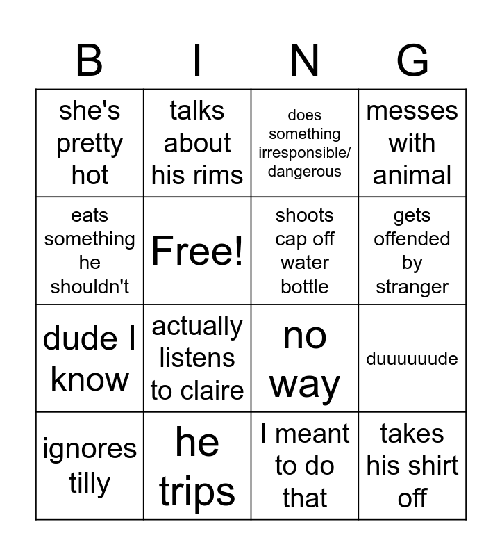 This bingo card has 16 words: he trips, duuuuuude, does something irresponsible/ dangerous, she's pretty hot, dude I know, talks about his rims, no way, I meant to do that, eats something he shouldn't, Free!, ignores tilly, messes with animal, actually listens to claire, gets offended by stranger, shoots cap off water bottle and takes his shirt off.