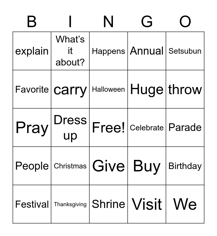 This bingo card has a free space and 24 words: Christmas, Thanksgiving, Halloween, Festival, Setsubun, explain, Favorite, What’s it about?, Celebrate, Give, Huge, Pray, Buy, Birthday, carry, Visit, Parade, Happens, throw, Dress up, We, People, Annual and Shrine.