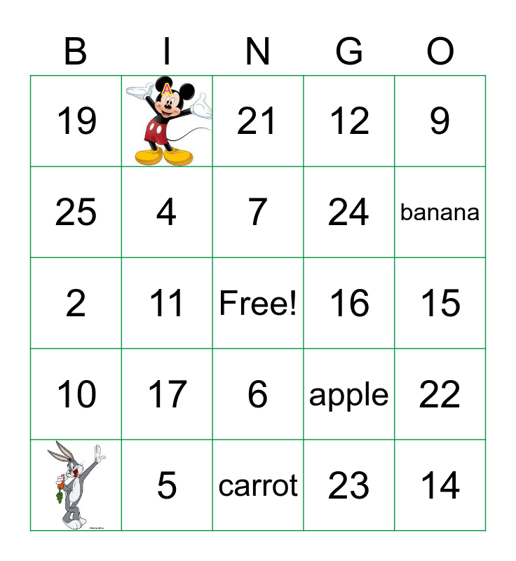 This bingo card has 11 images, a free space and 31 words: 1, 2, 3, 4, 5, 6, 7, 8, 9, 10, 11, 12, 14, 15, 16, 17, 18, 19, 20, 21, 22, 23, 24, 25, apple, banana, carrot, pear, pineapple, A and Addddd.